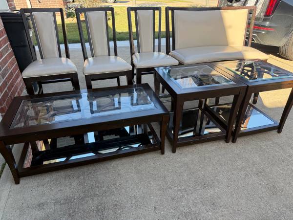 Includes wood dining table, dining chairs (included free), matching living room center table, and two end tables. Table has minor wear from normal use; small acetone spot can be easily covered with a placemat or runner. Chairs show wear and can be reupholstered.